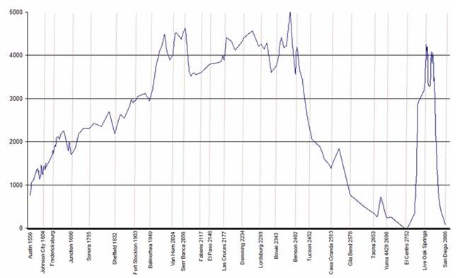 Horizontal = Number of cycled miles (1000 miles = 1610 km en 3000 miles = 2828 km)